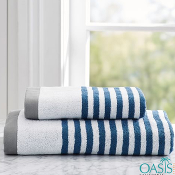 Enquiry for Private LabelThis awesome designer towel range comes with an instantly appealing aesthetic touch. The all-white towel has peacock blue stripes running across the body with a well-formatted satin border in grey, adding to its royal appeal. The enriched, high absorbent, quick dry and durable wholesale organic towels are available with Oasis Towels, top manufacturer and supplier.